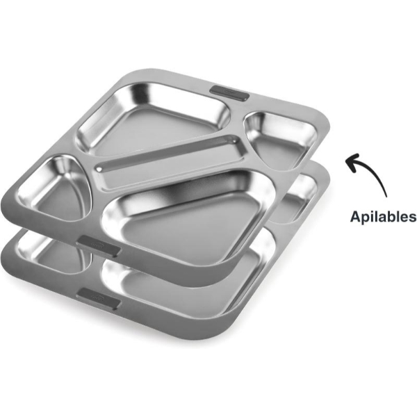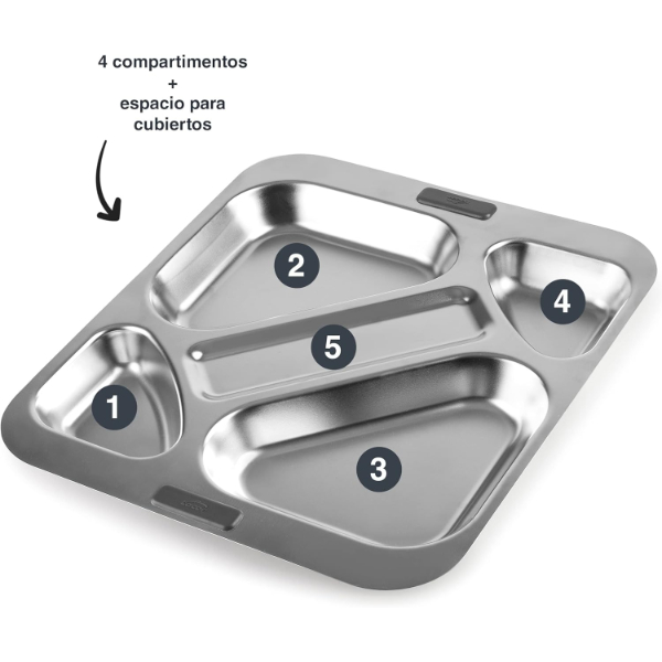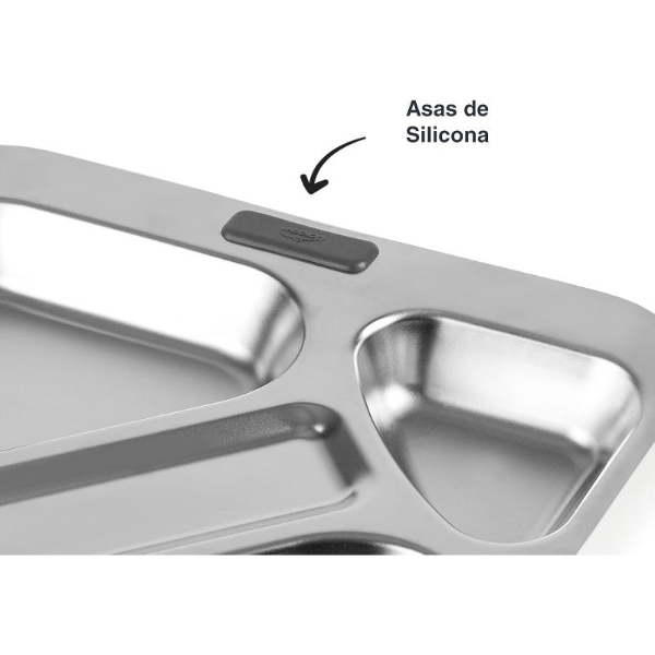 Dispone de 4 compartimentos + espacio para los cubiertos y cuenta con dos asas de silicona.