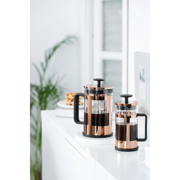 Fabricada en vidrio borosilicato, superresistente a los cambios de temperatura, e inox con un acabado en color cobre.