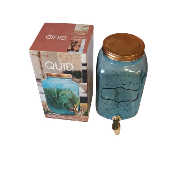 Dispensador bebida de cristal Modelo Arizona, en forma de tarro, con grifo y con tapa color cobre.