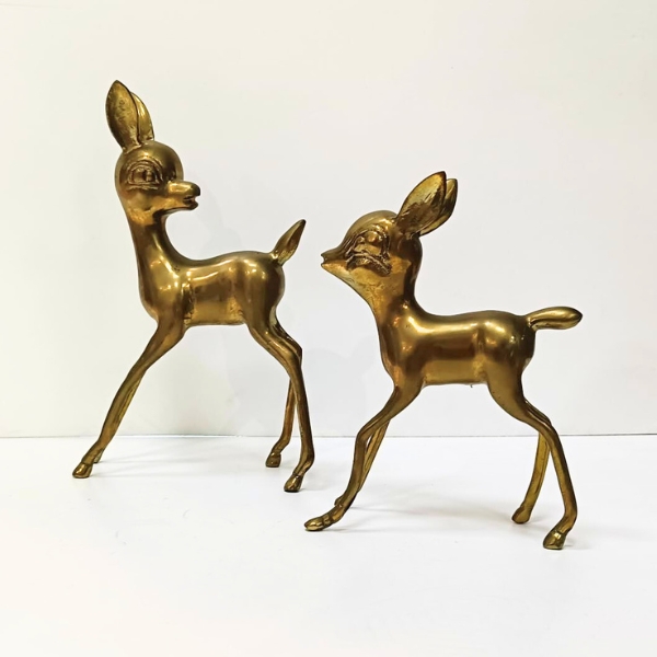 Encantadora pareja de figuras decorativas de Bambi elaboradas en bronce dorado, ideales para aportar un toque elegante y vintage a cualquier espacio.