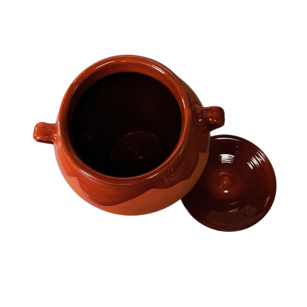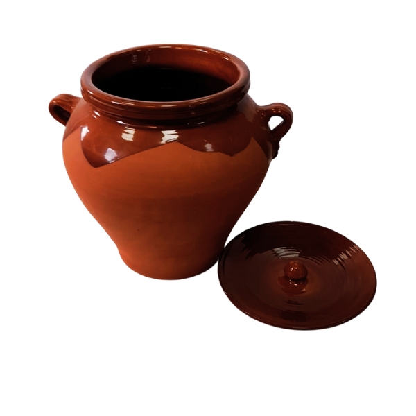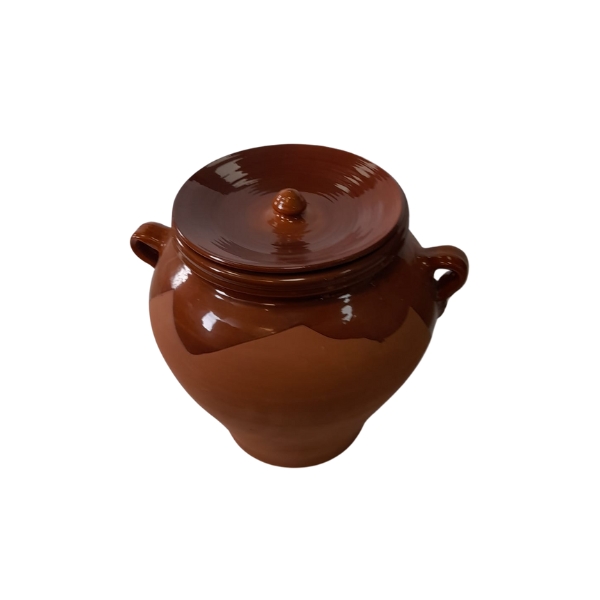 Orza de barro con tapa fabricada en barro y esmaltada, ideal para la conservación de alimentos así como para guisar y preparar las aceitunas, es también ecológica y respetuosa con el medio ambiente.