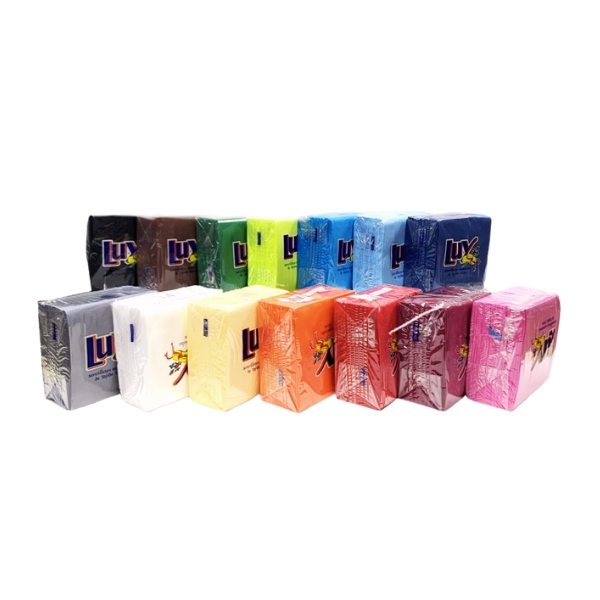 Presentada en caja de 1.200 unidades organizadas en 24 paquetes de 50 servilletas de color.